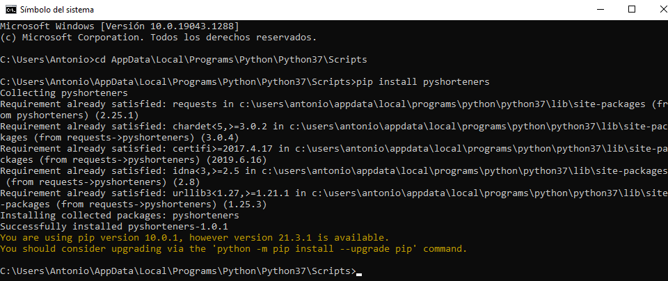 Una vez que estemos registrados y tengamos nuestra clave, pasaremos a realizar la instalación de la correspondiente librería para Python, empleando el gestor de paquetes de Python, ‘pip‘: